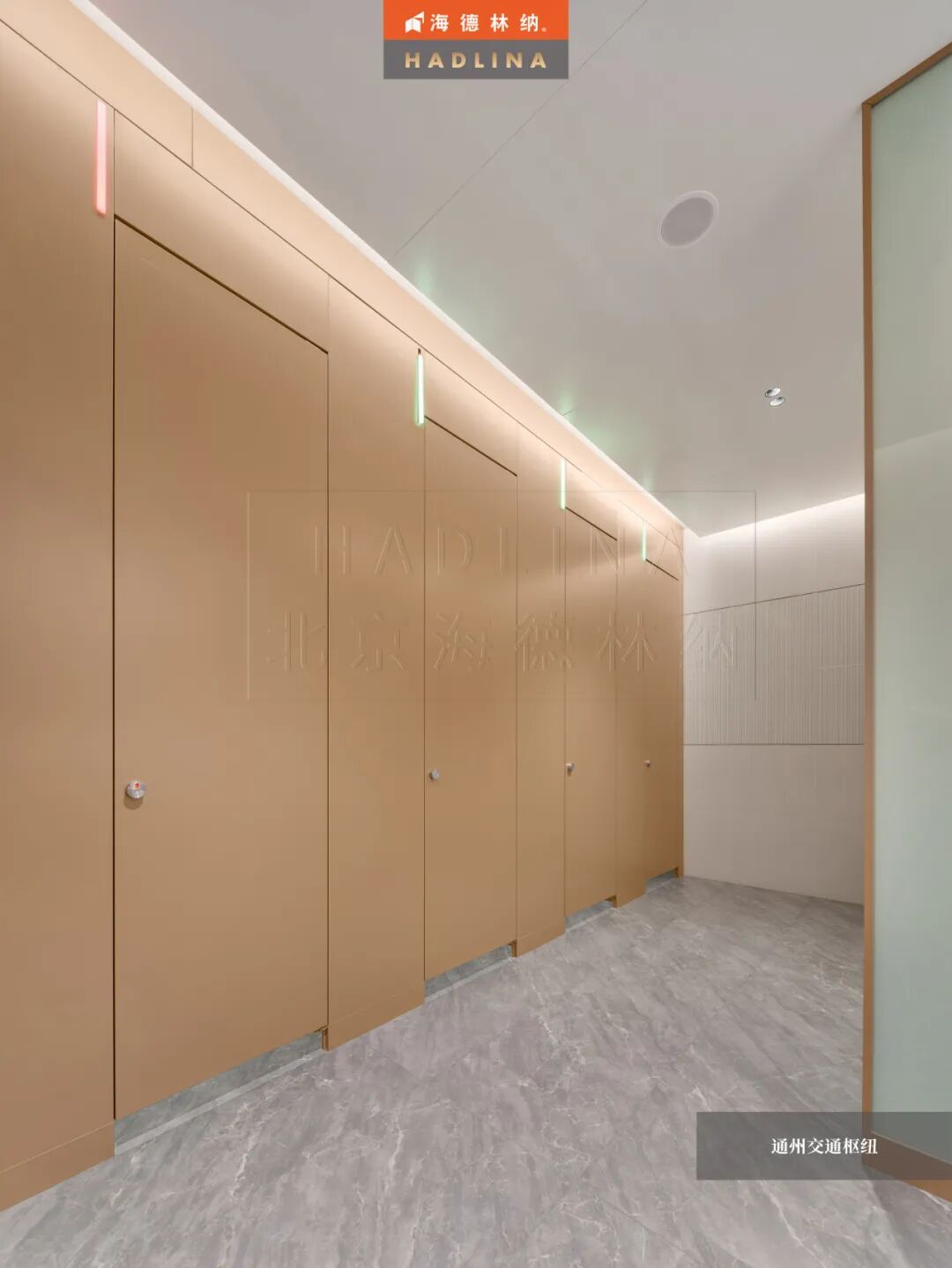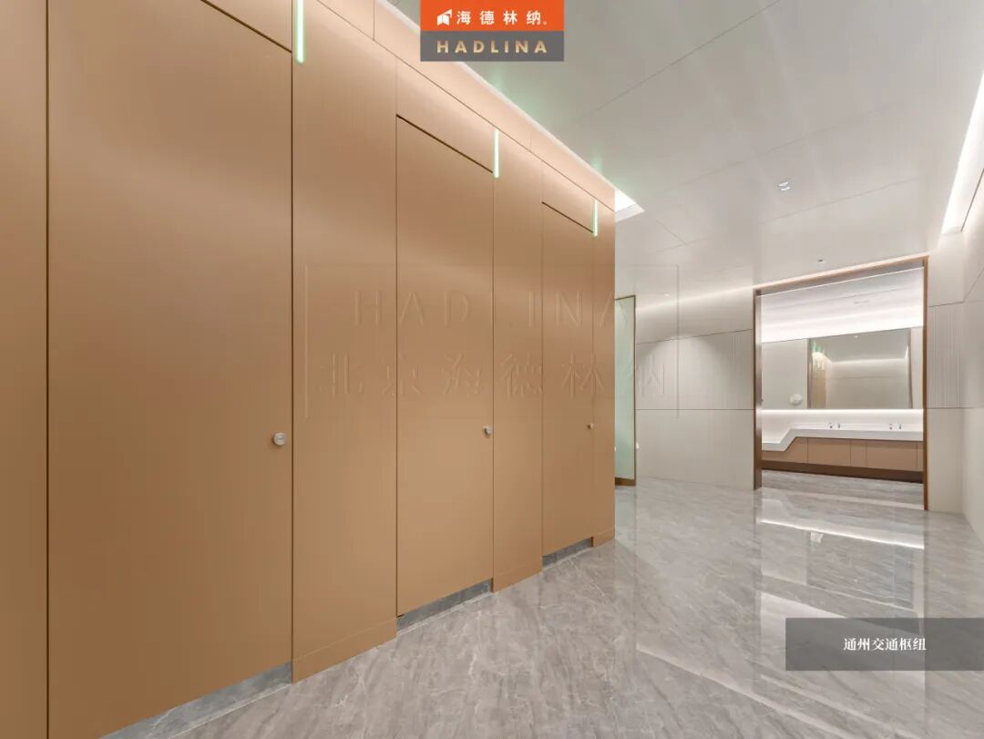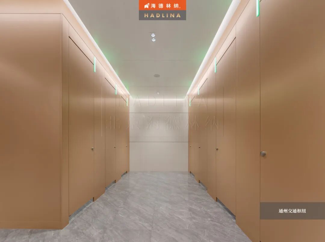 在此次通州交通樞紐項目中,海德林納?很榮幸為其公共衛生空間提供了定制化的隔斷系統解決方案。項目采用天地式安裝方式,確保隔斷在高人流環境下的穩固與耐用。26mm厚鋁蜂窩復合板材,子母口邊型與暗連接工藝相得益彰,讓每一塊板材之間的銜接如絲般順滑,呈現出渾然一體的視覺美感性。